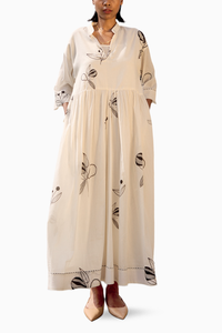 Featuring an off white mul dress with mandarin collars, front button opening, gathers around the wasitline and hand running stitches along the hem of the dress and the sleeves.