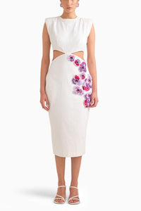 Featuring a waist cutout design, the Silvia Waist Cut Out Midi Dress by House Of Exotique offers a pencil fit silhouette. Hand-embroidered floral appliqué adorns the dress, complementing its fitted style, round neck, extended shoulders, and back zipper fastening. Crafted from twill in a tailored fit and pristine white color.