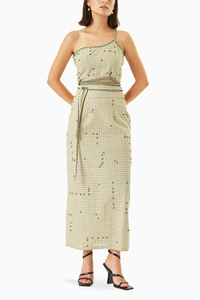 The Simone co-ord set is classy and quirky. With its minimalist checkered details and hand embroidered beads on the set, this ensemble gives some serious XOXO vibes. Wear this set for a special night out or on vacation.