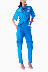 Featuring the Simone Knot Co-ord Set from House of Zeniaa's Mamma Mia Collection, a fusion of style and chicness. This set features a front-opening shirt with an optional knot and 3D flower embroidered patches, paired with versatile button-up pants that can double as shorts. Style it with sneakers for a casual vibe or heels for a formal brunch look.