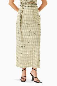 Simone is classy and quirky. With its minimalist checkered details and hand-embroidered beads, this midi skirt gives XOXO vibes. Pair it with our Simone Crop Top for the full effect.