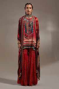 Featuring the Sindoor Anka Printed Mitra Short Kurta Festive Set by Aseem Kapoor’s ANKA collection. This relaxed-fit kurta with inserts pairs with printed sharara trousers, detailed with resham embroidery, cowri shells, M.O.P. beads, and tassels for a stylish festive look.