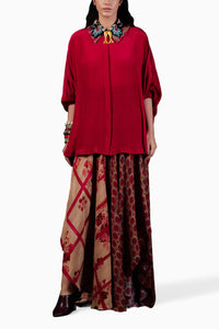 Discover the allure of Sindoor Mandala Embroidered Collar Shirt. the solid free size shirt, crafted from natural crepe, boasts an embroidered collar with intricate zari marodi detailing. Embrace the anti-fit design and elegance.