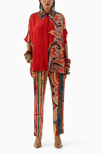 Elevate your style quotient with the Sindoor Mandala Shirt Set. The anti-fit, natural crepe shirt showcases an ambi print mandala and embroidered collar, perfectly paired with printed drape trousers featuring an expandable back waist.