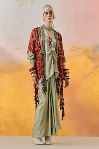 The Sindoor Mural Veni Dupatta Lace Jacket is a free-size, embroidered and laced printed jacket featuring tribal tassel details. Adorned with resham thread embroidery, beads, and tassel highlights, this anti-fit design offers a free-sized silhouette without armholes, creating a relaxed and flowing fit with intricate detailing.