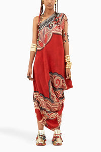 Elevate your style with Sindoor Rasa One Shoulder Dress and Sheer Silk Jacket. Crafted from natural crepe, the dress features an exquisite Ambi print, highlighting on the neck, tribal tassel detailing, and intricate dori and bead embroidery. The set includes a free-size sheer silk jacket for a complete, elegant look.