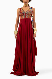 Featuring the elegant Sindoor Ruhani Jumpsuit in natural crepe. This slim-fit jumpsuit boasts exquisite zari and marodi embroidery, adding a touch of luxury to your style.