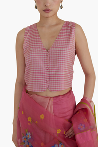 The Sisterhood Sonnet blouse features a handwoven gingham weave, and a silhouette inspired by a waistcoat. It is crafted in the softest handwoven silk modal.