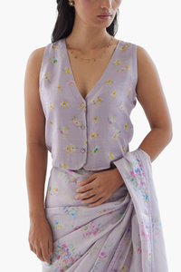 The Sisterhood Sonnet blouse features a hand-drawn pansy floral print and a silhouette inspired by a waistcoat. It is crafted in the softest handwoven mulberry silk.