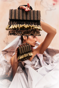 Featuring the Sister's Black-Gold Souvenir Bag by The Right Sided. This Bag offers a stunning blend of elegance and sophistication with its short-haired velvet (vegan) in a chic black and gold palette. Perfect for evening events and cocktail gatherings, this handbag brings a touch of luxury and refined style to any outfit.