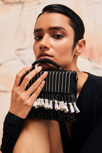 Featuring the Sister's Black-Silver Souvenir Bag by The Right Sided. This Bag combines sleek sophistication with a touch of sparkle, crafted from short-haired velvet (vegan) in an elegant black and silver design. Ideal for evening events and cocktail parties, this handbag effortlessly enhances your look with its luxurious texture and timeless appeal.