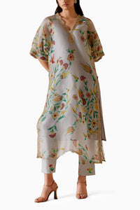 Showcasing a flattering silhouette, the Sitara kaftan-style tunic set is designed with exquisite lace and zari detailing. The neckline is embellished with sequins and stones, while elegant side slits enhance its flowy charm. Paired with printed pants, this set creates a beautifully coordinated look perfect for any occasion!