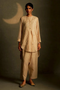 This beige hi-lo kurta set blends festive charm with modern ease. The front features subtle star motif embroidery with a soft shimmer—just enough to catch the light without overpowering. Paired with a relaxed, loose-style salwar, it’s a graceful yet contemporary choice for any festive outing.