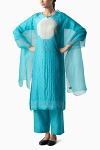 This is a Bandhani on silk kurta with a turquoise base and light turquoise yoke. The yoke comes highlighted with hand done gota patti work. It comes clubbed with sky blue silk pants and sky blue organza stole.