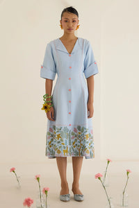 Featuring a lapel collar and flowing silhouette, the Sky Blue Floral Dress is a maxi style with floral embroidery at the hem. Contrast piping and show buttons add refined details, making it a graceful choice for any occasion.