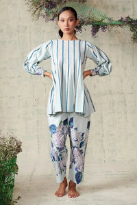 The Sky Blue Hydrange Co-ord Set offers a charming blend of floral and striped patterns, creating a stylish and coordinated ensemble. Featuring floral pants adorned with delicate hydrangea blooms in sky blue hues and a striped top in complementary shades, this set exudes both femininity and sophistication. The floral pants add a touch of whimsy and natural beauty, while the striped top offers a modern and chic contrast. Perfect for daytime outings or casual events, this co-ord set allows you to showcase your unique sense of style with confidence.