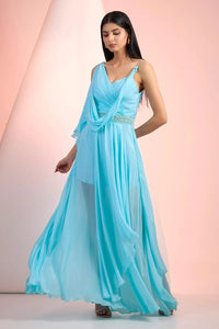 Featuring Sky Blue Love Pleated Dress by Mandira Wirk's Love Note Collection. This solid dress highlights a sky blue pleated neckline, adding subtle texture and elegance for a refined, graceful look.