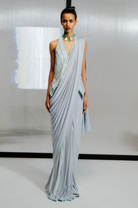 Composition: Slinky Jersey and Satin Lining Color: Sky Blue Embroidery: Pearl and Bugle Beads Fit: Relaxed Length: 46" Components: 1 Product Code: SVECITACT_BM-03 (B)