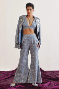 The Sky Blue Scallop Palazzo Pants from the Rangrez collection by 29 India are a graceful and elegant addition to any wardrobe. Rendered in a serene sky blue hue, these palazzo pants feature exquisite Mirrorwork embroidery, adding a layer of intricate craftsmanship and luxury. Crafted from luxurious Tissue fabric, the scalloped design enhances the flow and movement of the pants, creating a flattering, feminine silhouette. Tailored to perfection, these pants exude sophistication and elegance, making them the perfect choice for both formal and celebratory occasions.
