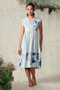 The Sky Blue Striped Hydrange Dress is a whimsical and charming garment that combines the elegance of sky blue stripes with the delicate beauty of hydrangea blooms. Featuring a sky blue striped pattern as the base, this dress is adorned with intricate hydrangea prints, creating a delightful and enchanting look. The blend of stripes and floral motifs offers a fresh and playful aesthetic, perfect for sunny days and outdoor occasions. Whether you're strolling through the park, attending a garden party, or enjoying a picnic, this dress exudes femininity and grace.