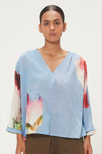 The Vinca Top is tailored in soft mul, An anti fit top detailed with a striking floral pattern on a fresh blue base for a modern, effortless look.