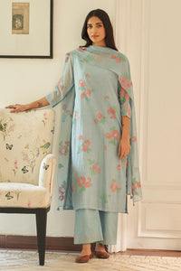 The Sky Floral Appliqué Kurta Set brings light, joyful charm with scattered floral appliqué on the kurta and sleeves. Paired with matching pants and a dupatta adorned with playful appliqué blooms, it’s an easy pick for bright days and breezy escapes.