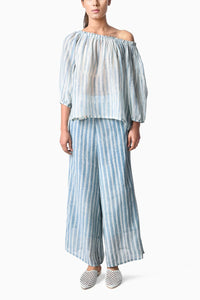 The Sky Off-Shoulder Co-ord Set features a breezy off-shoulder top paired with flared pants with lining. Crafted in blue Dabu hand-block printed Chanderi silk, printed in Bagru near Jaipur, this set offers effortless style with artisanal charm.