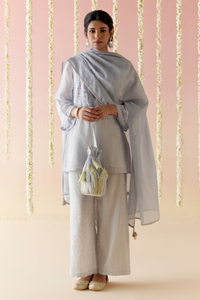 This elegant three-piece set includes a Kurta, Pant, and Dupatta, designed for both style and comfort. The Kurta, made from chic striped tissue fabric, features decorative laces for a touch of sophistication. It pairs beautifully with Flared Pants in Crush Tissue fabric, embellished with gota laces for added charm. The lightweight, sheer fabric ensures all-day comfort and effortless elegance.