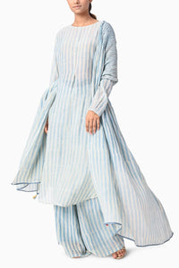 A simple matching block-printed kurta shorrt lining with paired with coordinated block-printed pants and a dupatta featuring ready-pleated smocking detail. The ensemble combines traditional block print motifs with contemporary styling, offering an elegant and cohesive look perfect for casual to semi-formal wear.