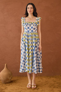 Crafted from lightweight, breathable cotton mul-mul fabric,this dress features a square scoop neck adorned with a contrasting short frill. The skirt is a flowy A line shape with curving panels adding a touch of contrast and a side zip closure.The delicate soft gingham checks lend an artisanal touch, mirroring the gentle textures found in nature’s canvas.