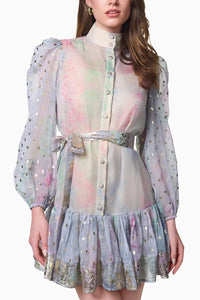 Elevate your style with this chic fit-and-flare dress, designed for the modern trendsetter. Crafted from luxurious foiled organza, it features a buttoned-down front, blouson sleeves, and a fabric belt for a flattering silhouette. Perfect for brunches or romantic dinners, this dress effortlessly transitions from day to night. Complete with a separate slip for added comfort, it's a statement piece for any occasion.