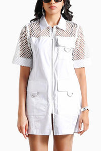 A white cotton twill dress with delicate white mesh detailing, offering a soft, refined silhouette.