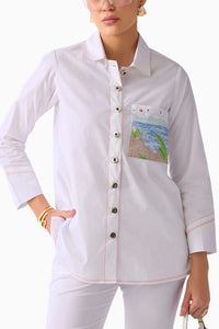 The Skysand white cotton embroidered shirt features a relaxed fit with snap buttons for easy wear. It showcases a beach embroidery patch on the front, complemented by orange stitch line details. With a straight fit, this shirt combines casual style and comfort effortlessly.