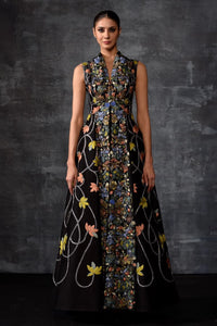 Make a bold statement in this sleeveless black gown, beautifully adorned with multicolored floral embroidery and a structured silhouette—where elegance meets artistic flair.