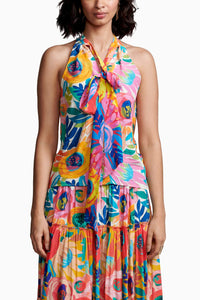 Sleeveless top in a hand-painted multicolour abstract floral print. Button-down front with tie-up neck detail. Relaxed fit.