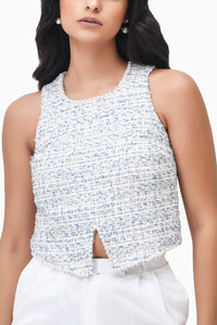 Embrace timeless elegance with this cropped tweed top, featuring delicate pearl embellishments along the neckline and hem. The sleeveless design and subtle front slit add modern sophistication, while the soft blue and white palette keeps the look fresh and refined. Perfect for day-to-night transitions.
