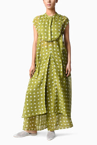 The Slit Tunic Henna Set features our signature printed button yoke tie styled with a sheer printed V-tunic, paired with printed pants with lining. Crafted in green Dabu hand-block printed Chanderi silk, printed in Bagru near Jaipur, it offers a perfect blend of intricate detail and effortless style.