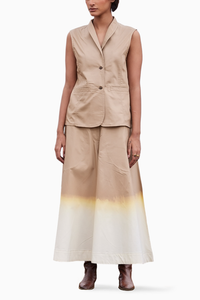 A beige oxford cotton co-ord set. The tunic comes with a shawl collar and front button opening with two front welt pockets. The flared trouser comes with front button opening, elasticated back and dip dyed hemline with two pockets..