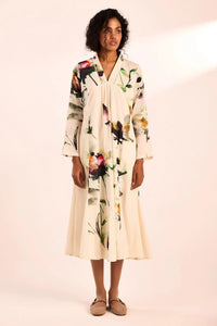 A midi dress on a white base, featuring a V-neckline, ladder lace detailing along the neckline and sleeves, and abstract watercolor-inspired prints. Designed for comfort with a flowy fit and functional pockets.