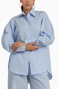 Featuring Sofia Ice Blue Shirts by Malie. This oversized shirt is expertly tailored with an inverted pleat and full sleeves for a relaxed yet polished look. Crafted entirely from 100% BCI cotton, it exemplifies our commitment to sustainability while offering unparalleled comfort and style. The covered button placket adds a touch of refinement, making this shirt a versatile and eco-conscious choice for any occasion.
