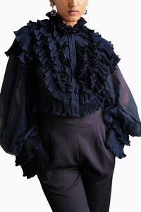 Featuring the Sofía Top by NSS's The Bloom Collection, a vision in Navy Blue crafted from Tulle. This top features voluminous sleeves and frill details, adding a touch of elegance and flair to your ensemble.