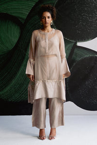 Featuring a sheer layered blush-toned kurta with flared sleeves and delicate floral embellishments, paired with matching straight trousers and an embroidered dupatta, this set is crafted in silk and organza, designed as an A-line with a relaxed fit, and finished with a graceful round neck.