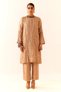Featuring a soft beige kurta with slight A line cut and delicate embroidery detailing all over the front of the kurta, paired with matching trousers adorned with geometric embroidery near the hem. Crafted in silk, this A-line ensemble offers a relaxed fit and is completed with a round neck for a refined and effortless look.