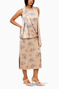 A soft blush toned midi dress featuring a fluid drape detail in satin