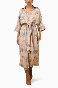 Soft blush floral midi dress featuring a relaxed shirt style silhouette, with a tie waist detail