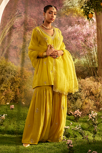 Step into elegance and grace with this exquisite Gharara set crafted from soft chanderi fabric, renowned for its lightweight and luxurious feel. The entire ensemble is meticulously lined and adorned with beautiful hand embroidery, creating a mesmerizing tapestry of intricate patterns and designs that speak of artisanal skill and timeless beauty. Accompanying this gharara is a dupatta made from sheer organza and intricately embroidered on all four sides.