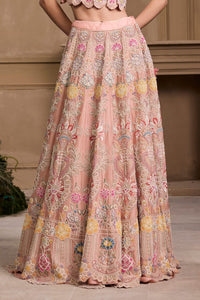 This soft pink Chanderi lehenga is a beautiful blend of elegance and intricate craftsmanship. Adorned with contrasting cordwork and delicate beadwork, it showcases detailed artistry against the soft pastel hue. The Chanderi fabric gives the lehenga a graceful drape, perfect for festive occasions or weddings, creating a refined look with a contemporary edge.
