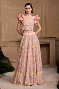 This enchanting soft pink Chanderi set features a ruffled bustier adorned with contrasting cordwork and delicate beadwork, creating a perfect blend of elegance and modern flair. The matching lehenga, crafted from soft pink Chanderi, is intricately embellished with the same contrasting cordwork and beadwork, ensuring a seamless and harmonious look. Together, the bustier and lehenga create a sophisticated, feminine ensemble, ideal for weddings, celebrations, or festive occasions, adding a refined yet playful touch to your wardrobe.