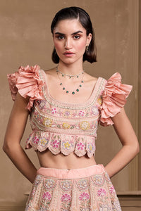 This soft pink Chanderi bustier exudes elegance with its contrasting cordwork and delicate beadwork detailing. The addition of ruffled accents adds a playful yet sophisticated touch, creating a piece that blends traditional charm with modern style. Ideal for festive occasions or intimate gatherings, this bustier offers a refined and unique aesthetic for a standout look.