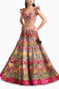 The Soft Pink Chanderi Multicolor Floral Threadwork, Beadwork, and Cutwork Lehenga set is a masterpiece that combines delicate craftsmanship with a vibrant aesthetic. The chanderi fabric sets the tone with its lightweight and graceful texture, ideal for warm weather and festive occasions. The intricate floral threadwork brings the ensemble to life, creating a tapestry of multicolor blooms that cascade across the fabric, adding depth and dimension to the design.
